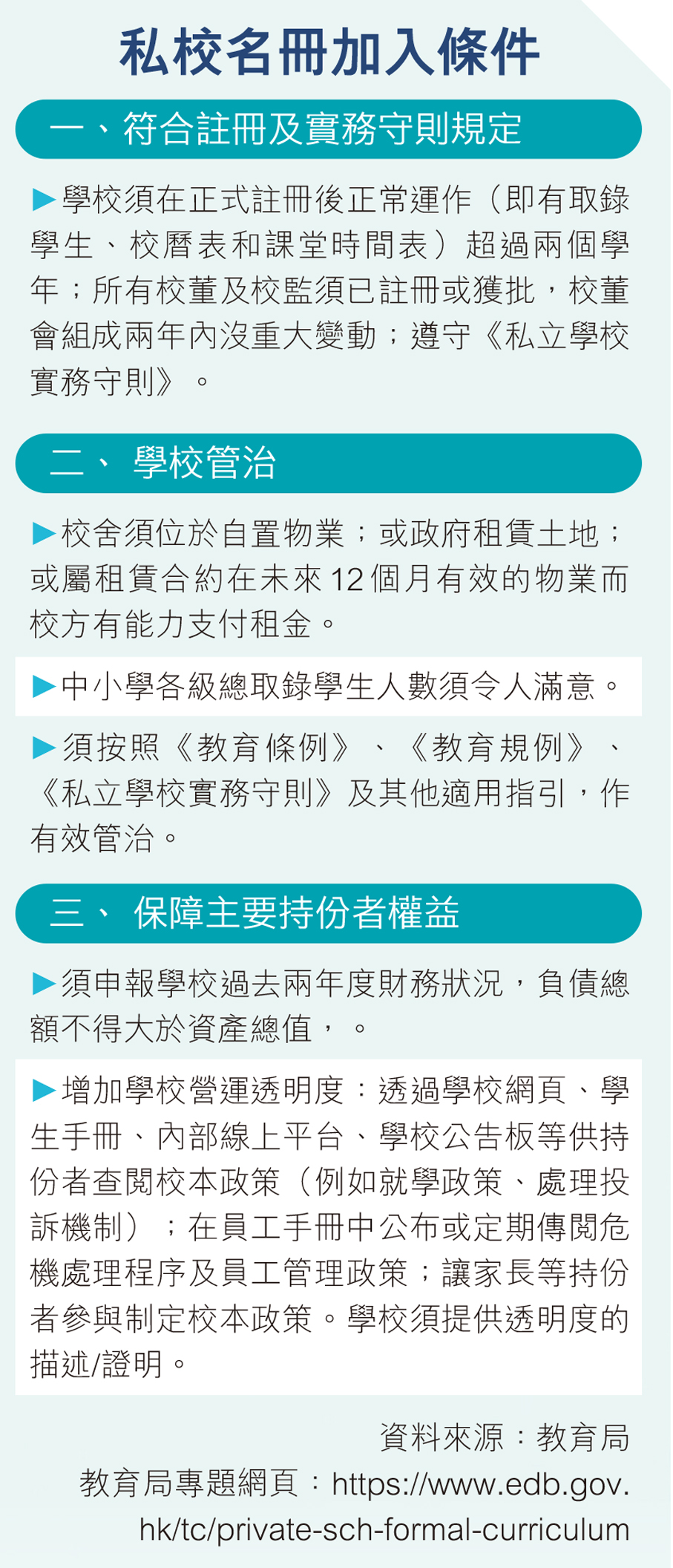 為完善香港私立教育生態,教育局今年1月推出私校實務守則,就私校的學校管理、財務、人事、校舍及安全、學與教、學生事務等六方面提供清晰營運指引;至昨日局方亦發出通函,公布加入私立學校名冊條件,並邀請學校加入,逐步落實私校質素保證新制度。