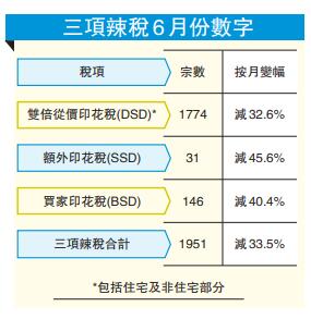 上月樓市受中美貿易戰及本地政治爭拗夾擊,影響整體入市氣氛,三項辣稅於6月份價量全線告跌。根據稅務局數字顯示,6月份3項辣稅總宗數為1951宗,涉及總稅額20.27億元,分別按月減少33.5%及21.6%。