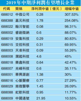 從首批掛牌上市企業的業績來看,與去年同期相比,僅2家2019年中期淨利潤增幅中值為負數:鉑力特續虧、新光光電淨利潤下滑。從業績增長股來看,15股今年中期有望實現盈利,且淨利潤增幅超10%。其中,中微公司、嘉元科技淨利潤增幅中值均超過2.5倍。另外,瀚川智能、安集科技、天準科技等5股2019年淨利潤增幅中值均有望超過50%。