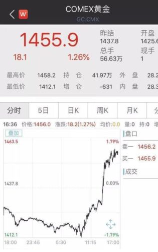 COMEX黃金期貨漲至1455美元/盎司,明顯脫離美股盤前錄得的日低1412.10美元/盎司,創下近期新高。