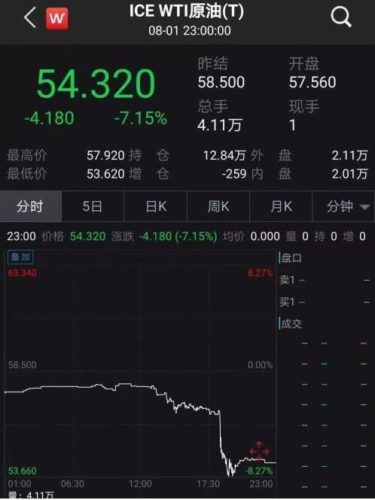 受朗普宣布將從9月1日對中國3000億美元輸美商品加征10%關稅和美聯儲降息預期低於預期影響,國際油價1日早盤維持前一交易日盤後的下跌走勢,盤中弱勢震蕩,午後因特朗普加征關稅表態陷入暴跌。