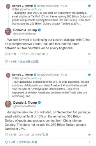 川普推文說,「…在談判期間,美國將從9月1日起開始對其餘3千億美元的中國進口商品小幅加徵10%關稅。這不包括已課徵25%關稅的2500億美元商品…」