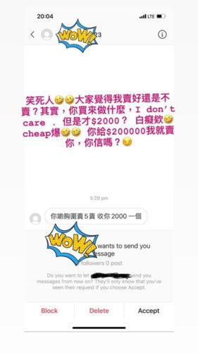 白雲於社交網上載一張對話截圖,對話中有人出價2000元,欲購買白雲的胸圍,而她則在社交網留言:「笑死人,大家覺得我賣好還是不賣?其實,你買來做什麼,I don’t care. 但是才$2000?白癡欸!Cheap爆!你給$200000我就賣你,你信嗎?」