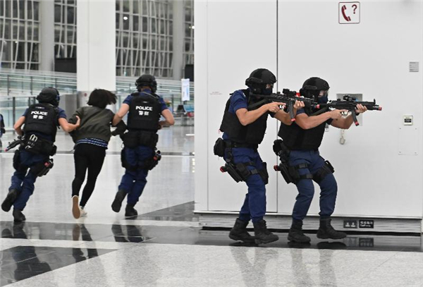 「鐵志」演習展示警隊不同單位及相關持份者在處理恐怖活動事件時的協調和應變能力。警方將繼續加強反恐工作,提升香港的反恐部署和能力,防範本土恐怖主義滋生。(圖片:政府新聞處、中通社)