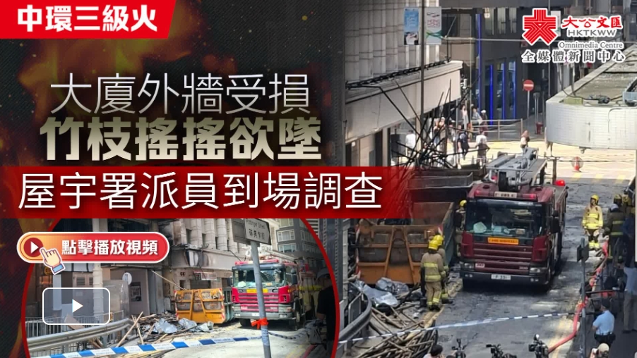 中環三級火|大廈外牆受損竹枝搖搖欲墜
