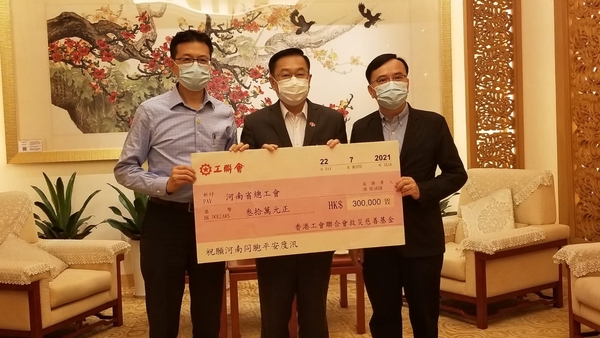 工聯會慈善基金亦宣布,緊急撥出30萬元,為河南救災獻出力量。工聯會會長吳秋北、理事長黃國昨日將捐款支票交予香港中聯辦,由中聯辦副主任何靖代為接收,轉交河南省總工會。