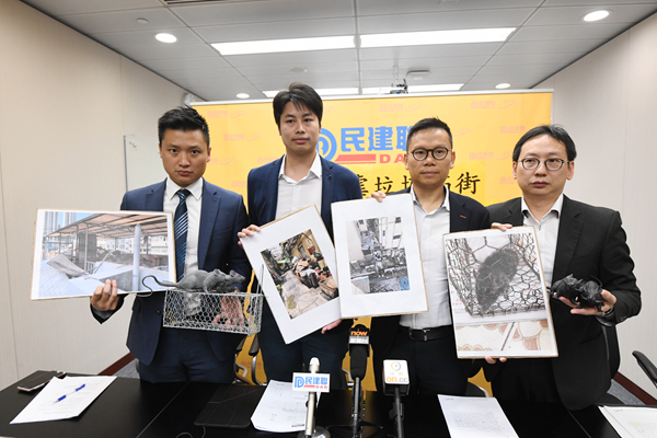 民建聯立法會議員何俊賢、鄭泳舜、陳恒鑌、柯創盛昨日舉行記者會,公布該黨最新完成的「鼠患與衛生黑點巡查」結果。調查發現,全港衛生黑點數目有169個,其中數目最多的衛生問題是「鼠患滋擾」,共有66個衛生黑點;其次是「垃圾與雜物堆積」有63個黑點;排第三是「建築廢料及回收物品堆積」有29個黑點。66個鼠患黑點中,佔最多宗數的是元朗區有16宗;九龍城、沙田同樣有8宗鼠患緊隨其後。