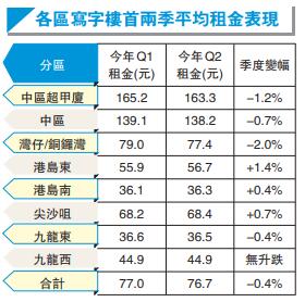 受到中美貿易摩擦、香港政治環境不穩影響,第二季香港寫字樓及商舖租賃市場表現欠佳。戴德梁行表示,香港上季寫字樓租金按季下跌0.4%,年初至今下跌0.2%,受到外圍不明朗及核心區超甲級寫字樓租金下跌影響。