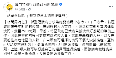 澳門政府今日(2月1日)公布,首批10萬劑國藥集團的滅活疫苗最快今個星期內交付,農曆新年前後可安排接種。另外10萬劑復星BioNTech疫苗,亦預計今個月下旬交付,3月安排接種。至於牛津阿斯利康疫苗最快今年第3季交付。