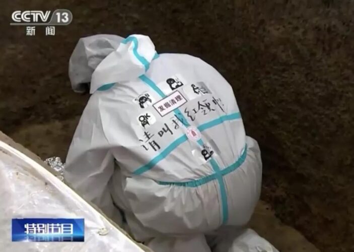 考古工作人員身著防護服