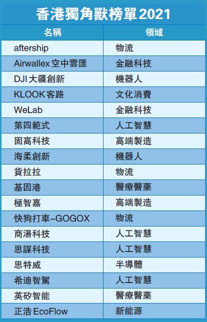 上榜的獨角獸,包括香港創立、早期孵化、總部在香港,以及創始人為香港居民的企業,全部均獲得過私募投資,且尚未上市、估值在10億美元及以上,符合獨角獸的國際標準。上榜的公司必須同時符合香港及內地的法規要求,以高端製造、機械人、人工智能領域為最多,另外還有金融科技、醫療醫藥、半導體、物流、文化消費以及新能源賽道等。其中,超級獨角獸DJI大疆創新、SenseTime商湯科技、Lalamove貨拉拉,市場估值逾百億美元。