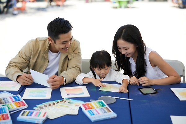 家長於周末期間可帶子女到昂坪市集體驗「和諧粉彩工作坊」。工作坊由導師即場指導,以手指指頭及簡單工具,將乾粉彩粉末於畫紙上慢慢塗抹上色,製作獨一無二的作品,共度專屬的親子時光。