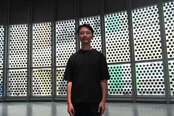 展廳的另一處擺放着陳沁昕的《三謎語(幻影)》和鍾正的《驅動未來01》。陳沁昕的作品以尼龍流蘇掩蓋燈箱,絢麗的彩光滲入窗簾,讓人聯想起黃竹坑鋪天蓋地的燈箱廣告,同時反思城中公共和私人空間的模糊界線。《三謎語(幻影)》對面的《驅動未來01》,以本地標誌性的鏡面建築為主題。LED大屏幕上的玻璃幕牆反射着刺眼光芒,加上天花上的夭花龍骨架展示出黃竹坑的剛強一面,與《三謎語(幻影)》的並置反映了這個工業區的陰與陽。