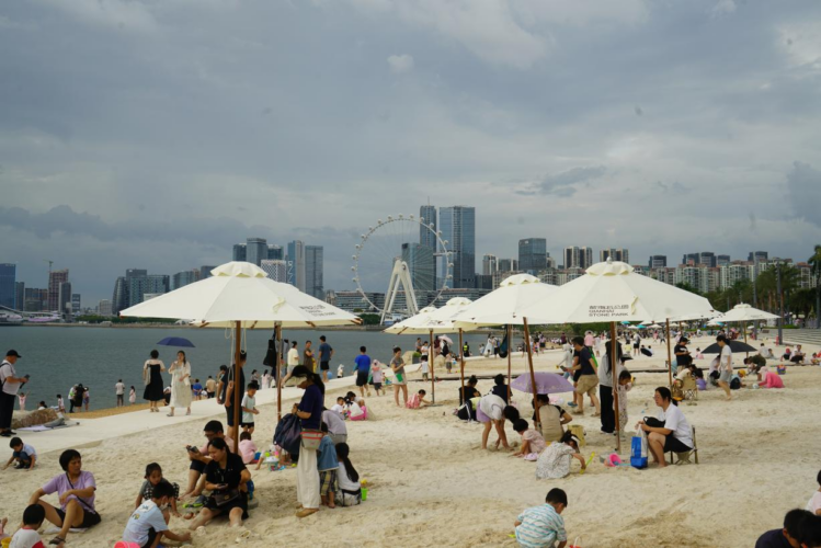 逛完「灣區之眼」書城,經過歡樂港灣一路徒步或騎行,二三十分鐘後可到達前海石公園。經國慶前期烈日晾曬後,公園內的「都市沙灘」恢復特有沙質的本色,細膩柔軟如麵粉一般,踩上去沒有一點硌腳的碎石感,吸引來大批家長一邊欣賞都市濱海美景,一邊陪着孩子嬉戲挖沙。偌大的沙灘被挖得「溝壑縱橫」,童趣十足。