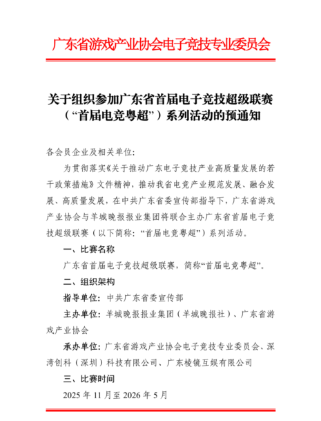 11月17日,廣東省遊戲協會發布關于組織參加廣東省首屆電子競技超級聯賽(「首屆電競粵超」)系列活動的預通知。