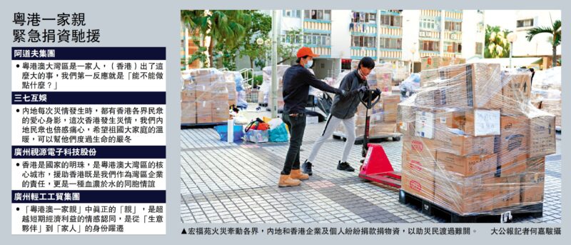 【識港網訊】「粵港澳一家親,援助香港不僅是企業責任,更是血濃於水的同胞情誼。」香港大埔宏福苑火災發生後,一批愛心粵企主動擔當,第一時間捐出善款支援香港進行災後救援、重建等工作,企業負責人更不約而同地對記者說出這句話。有企業在火災發生後不到兩小時,便確定了各項捐贈細節;也有企業不到20小時就通過廣州市慈善會向香港紅十字會捐贈一筆200萬元的善款。患難之中,一衣帶水的粵港之間更顯真情。