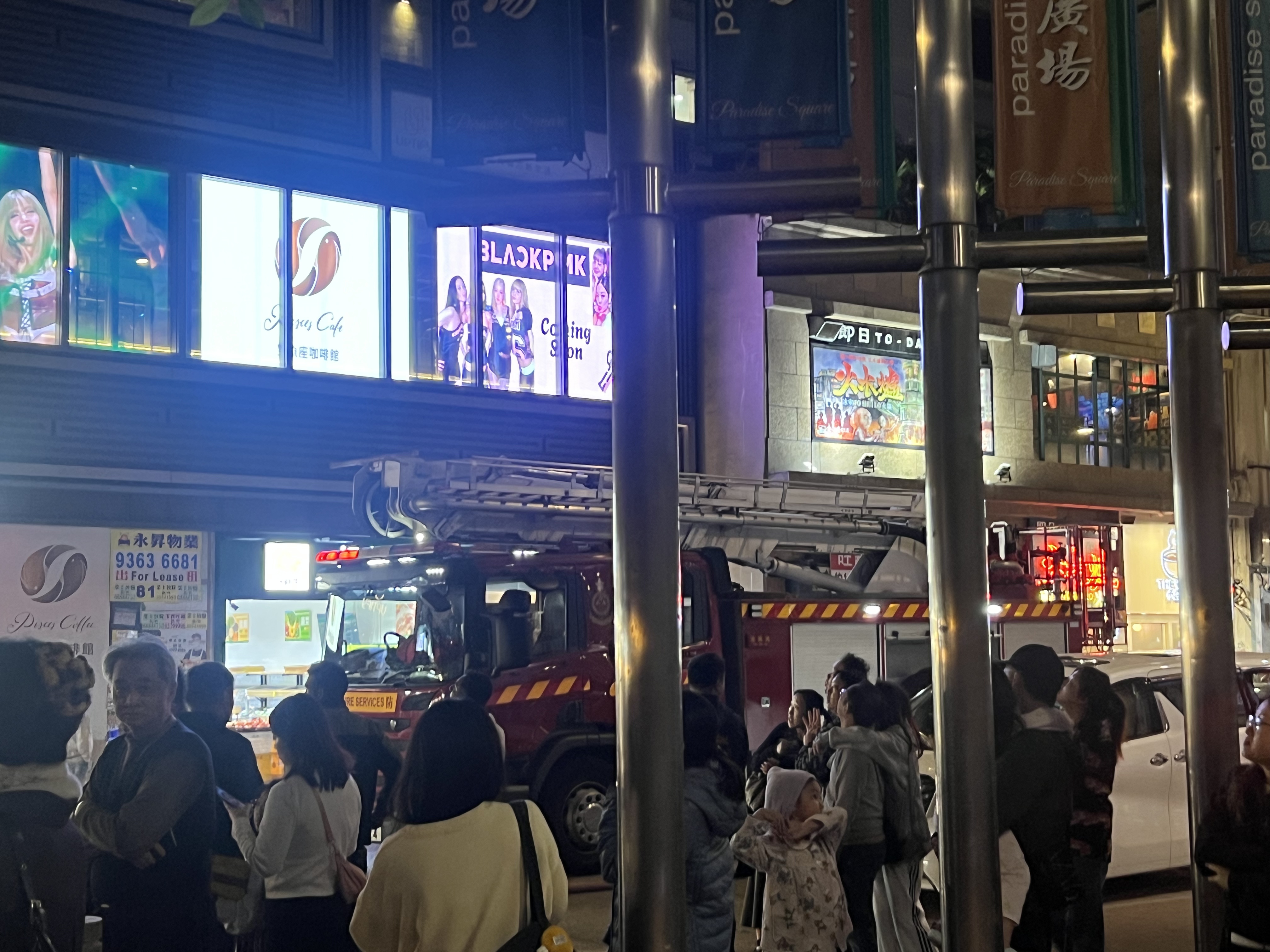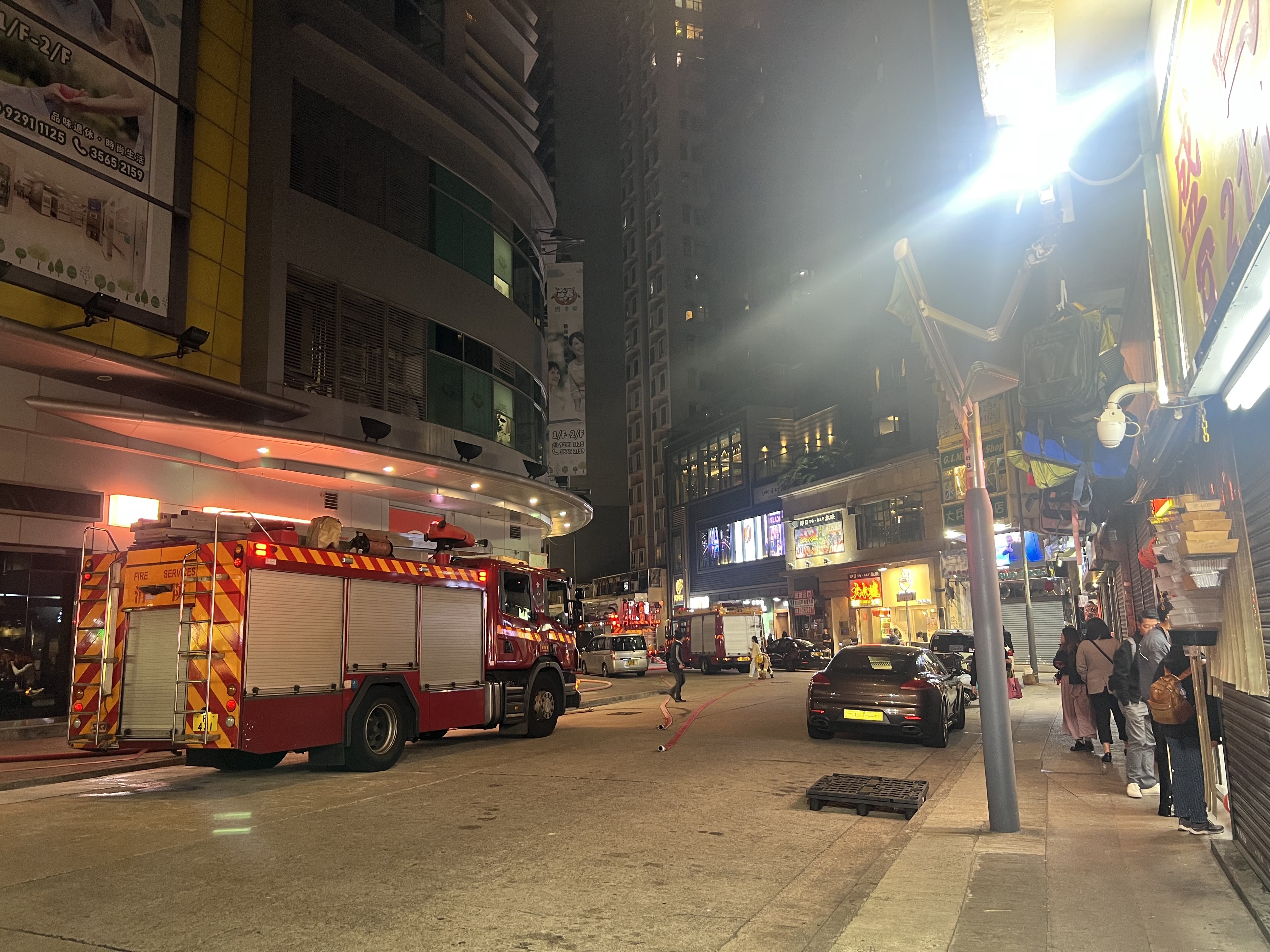 現場可見,後巷雜物堆火光熊熊,火焰一度燒至比人高,不時傳出「砰砰」爆炸聲,消防員一度暫避;一批市民則在後巷的其中一邊出口圍觀,有人大叫「消防員加油!」消防員讓他們「借借先,危險!危險!」