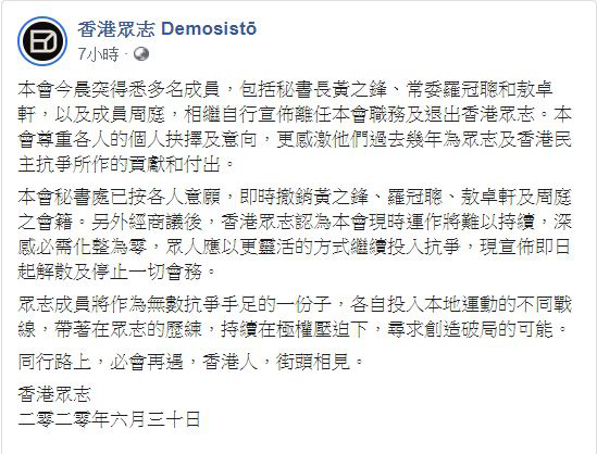 香港國安法即將實施,「港獨」組織「香港眾志」在Facebook發表解散聲明。香「香港眾志」Facebook專頁截圖