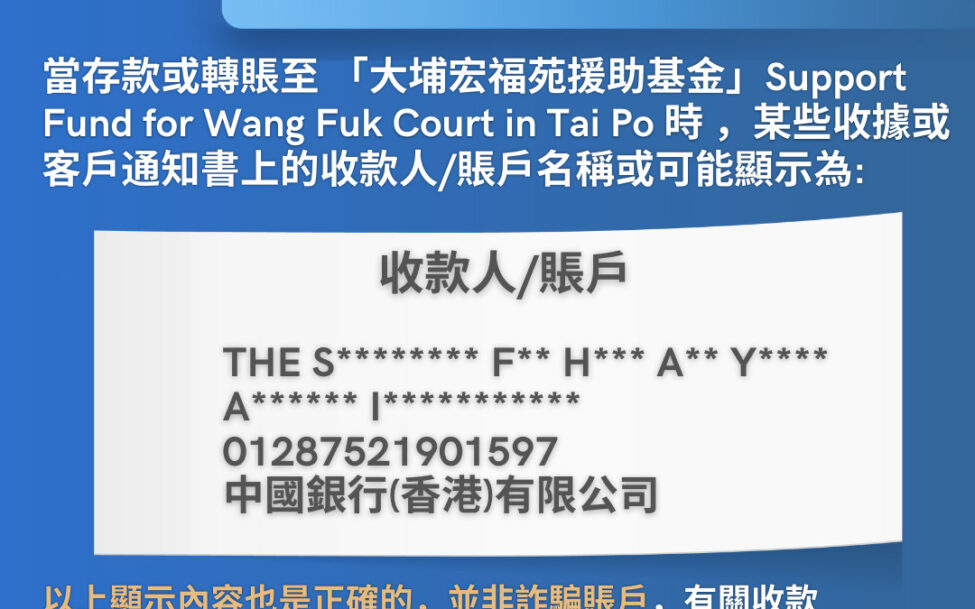 有關援助基金捐款事宜 民青局收到不少查詢,有些熱心人捐款時於網上捐款時會看到戶口名稱為「The S** H* Y* A* I*」 或者 「T* S** H* Y* A* I**」,與基金的英文名「Support Fund for Wang Fuk Court in Tai Po」不一致,擔心是詐騙賬...